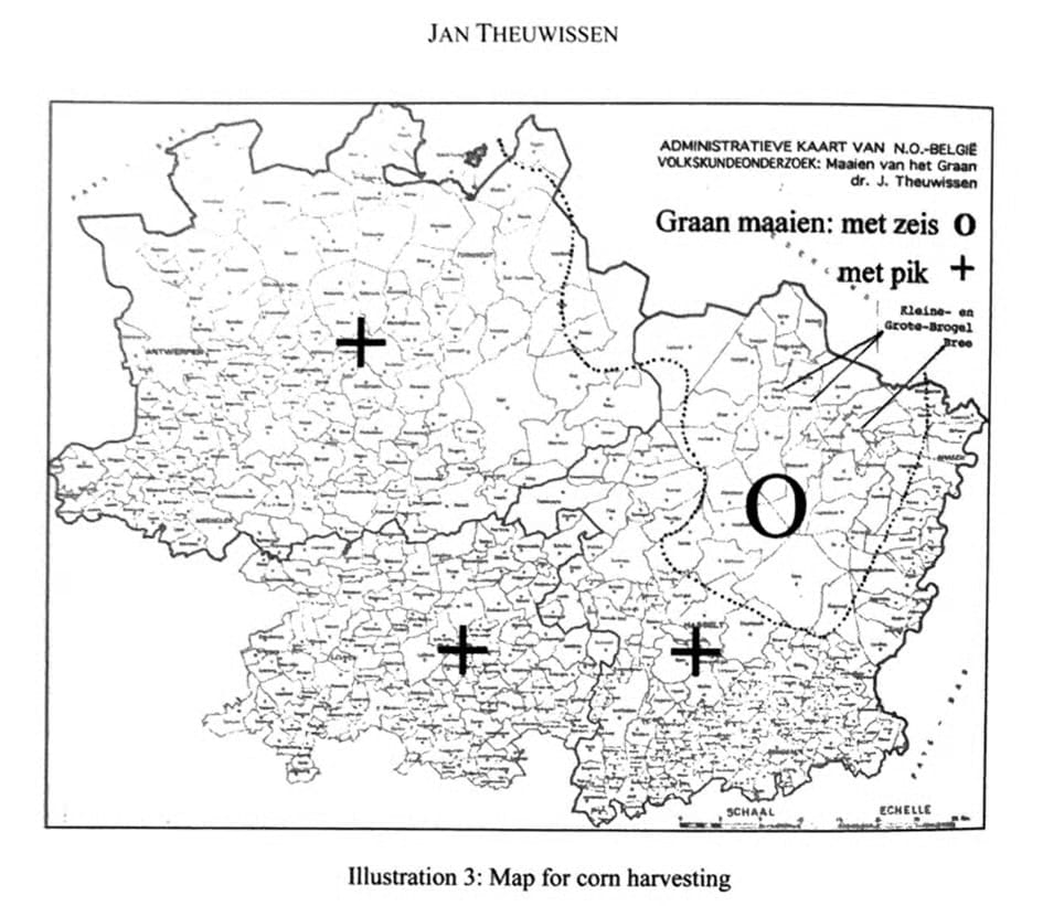 Advancing insight led to the question: "Why would Bruegel, who was born and raised in Brabant and lived and worked there for most of his life, choose the scythe from the Loonse Kempen for his painting of the corn harvest, when in most of the Low Countries, more specifically in Brabant (including North Brabant in the Netherlands) and Flanders, the hay and grain harvest was predominantly done with hooks and sickles?"